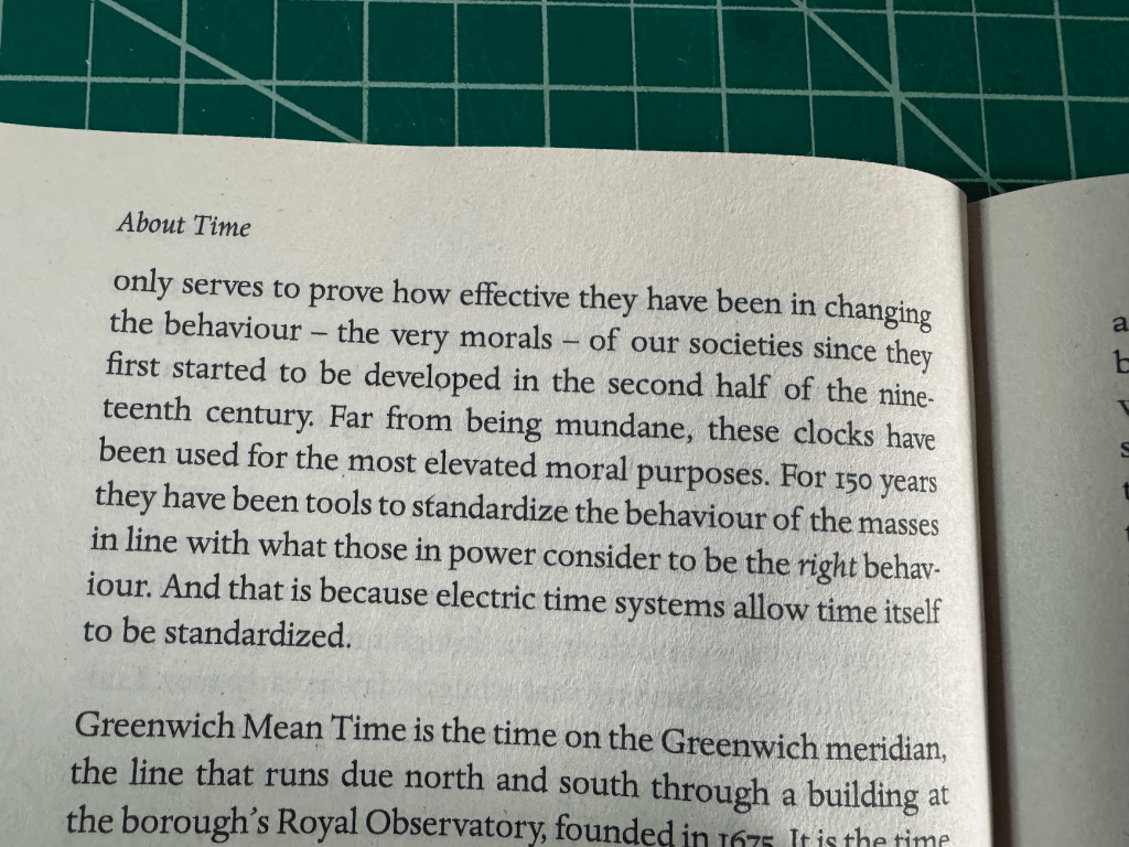 Pre-industrial societies worked to task-time — you milked the cow when the cow needed milking, you fished when the tide was right. The mechanical clock and the factory bell imposed a different regime: synchronised, disciplinary, abstract. And crucially, it wasn’t just imposed from above: it was internalised, through schooling, religion, print culture, until it felt like common sense.